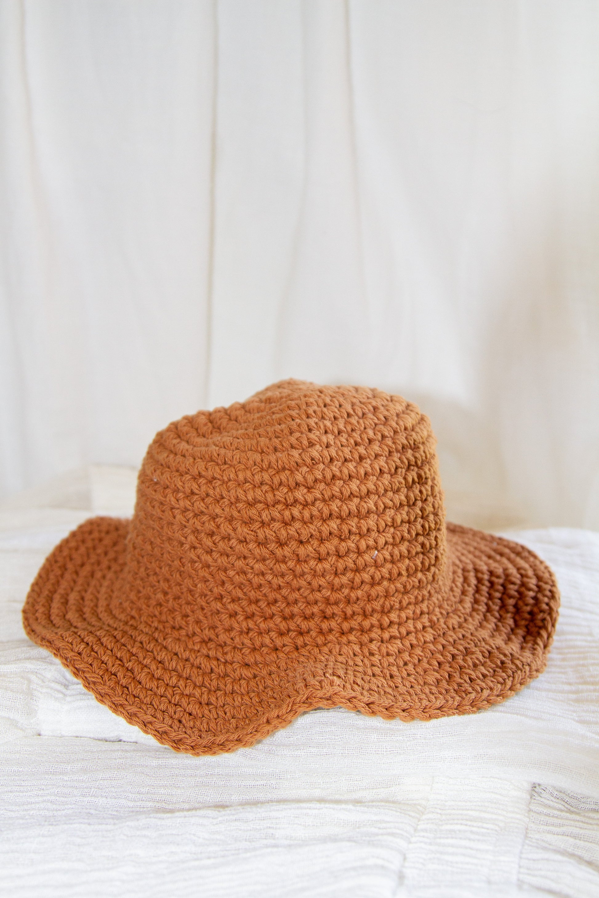 A soft textured bucket hat with a short brim - hand woven from 100% cotton. Beautiful and soft on the head without the fuss of cords.