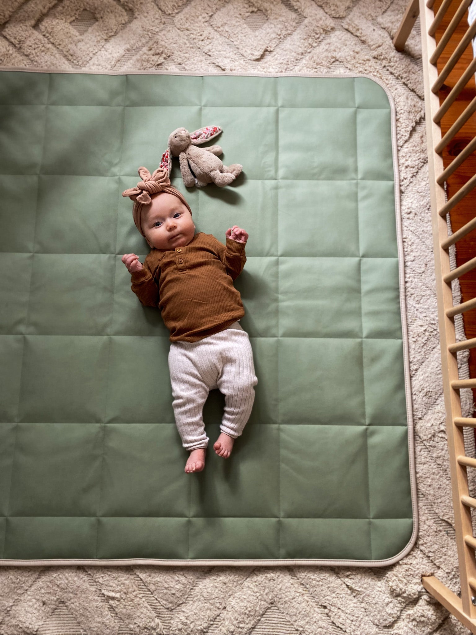 Our Vegan Leather Padded Mat is designed for those moments that need a little more padding! From the newborn stage to beyond - our padded mat provides you with the comfort you need for everyday activities. Features all the benefits of our bonded leather mats (without the leather!) - durable, stain-resistant, and free from all nasty toxins such as BPA and Phthalates. Our double-sided mat will fit in with any decor, one side featuring a subtle nude and the other side a soft olive leaf green - all packaged in a large canvas tote, ready for you to take with you anywhere you need!